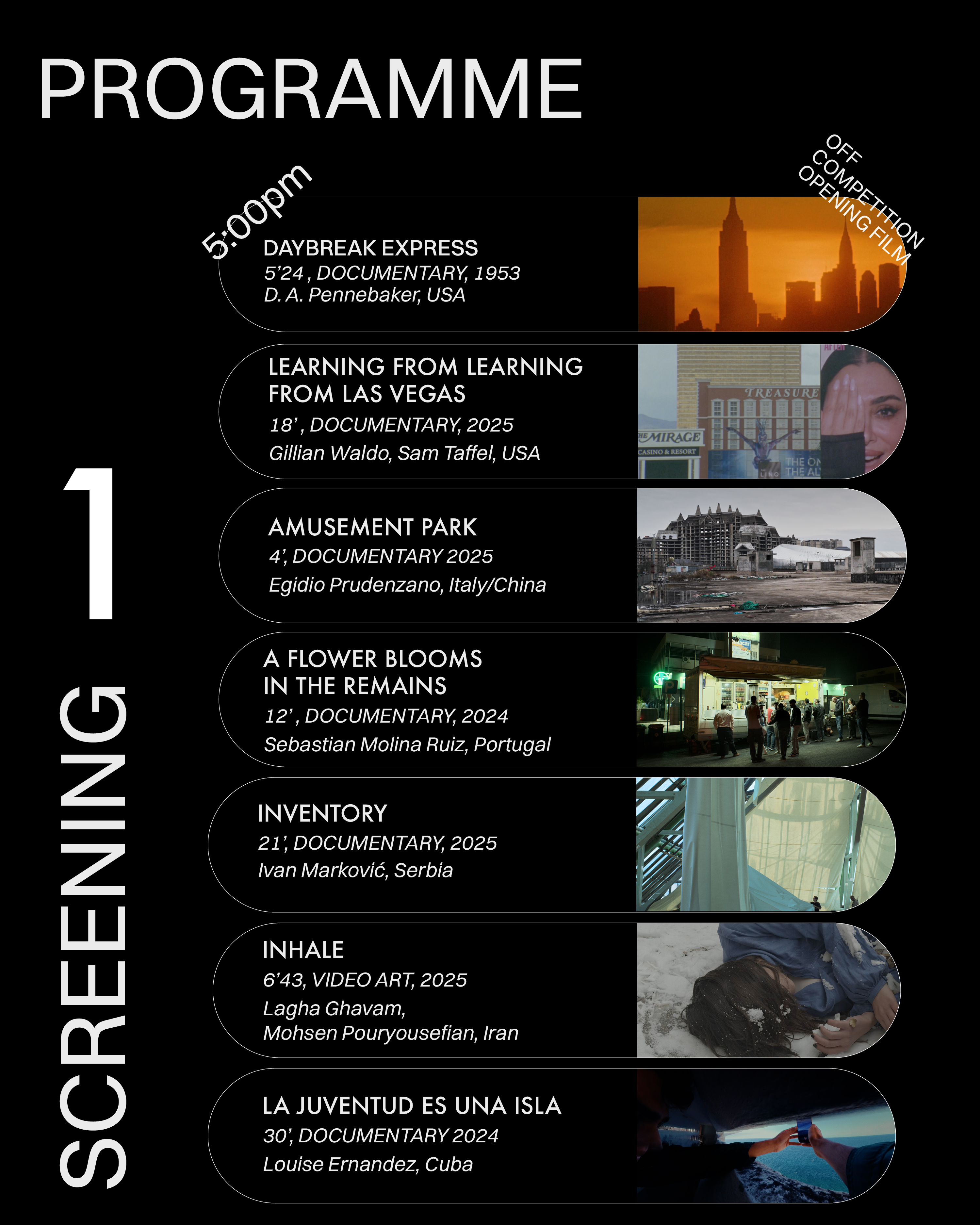 Short film is a field of experimentation that allows for formal, limitless expression of cinematic language: how can we describe the transcendent relationship between cities and the filmic object? How can we capture the energy and historical force that emanate from a building, from a street name, from the memory of a monument? How does a city unite as much as it alienates, rise as much as it shatters, reveal its labyrinthine structures as much as it surveils?